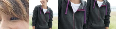 - Front zippered pockets with knotted zipper pulls and binding trim
