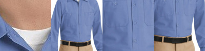 - Two button-thru, hex style pockets with angled bartacks, bartacked pencil stall on left pocket