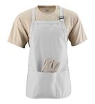 65% polyester/35% cotton twill * 1-inch wide neck strap with slider adjustment * 1-inch wide waist ties, reinforced at stress points * Triple-divided pouch pocket * Rounded bottom with self-fabric binding * 22" x 24"