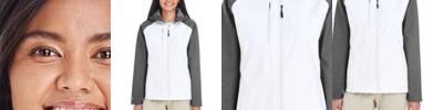 96/4 polyester/spandex bonded to brushed jersey Sleeves, hood and panels have Tech Print pattern detail Adjustable hood Dual front and chest zippered pockets Dual inside pockets Adjustable drop tail hem with hidden drawcord