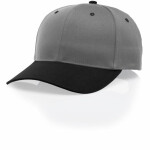 Cotton-poly blend fabric; ProCrown shape with buckram-fused front panels; ProSweatband with twill face; pre-curved PE visor with eight rows of stitching; adjustable plastic back strap.